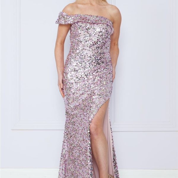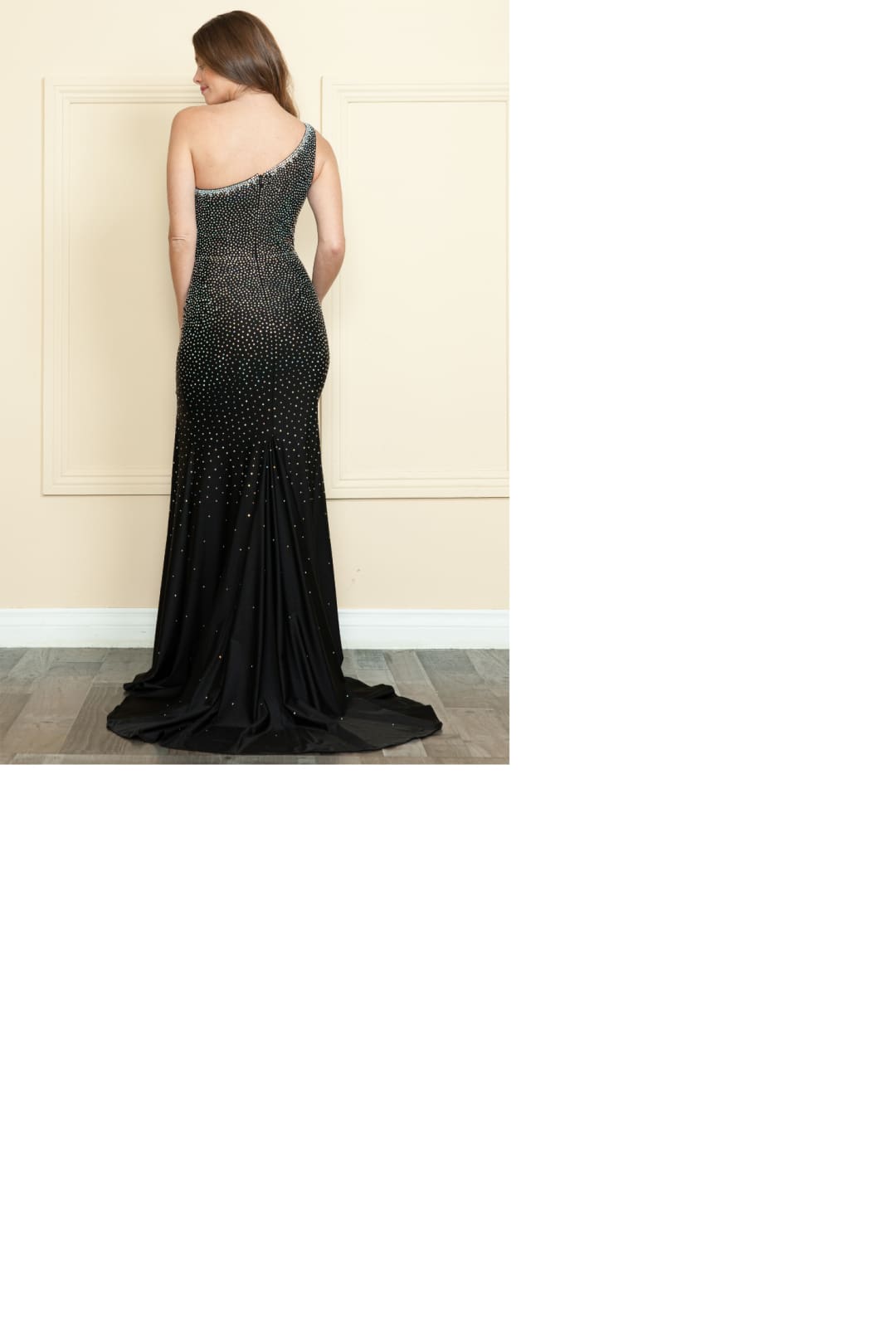 - Details: One-Shoulder, Rhinestone Embellished, Side Slit, Back Zipper Closure, Soft Cup Padded Inserts, Sweep Train.