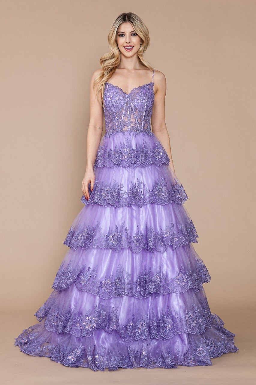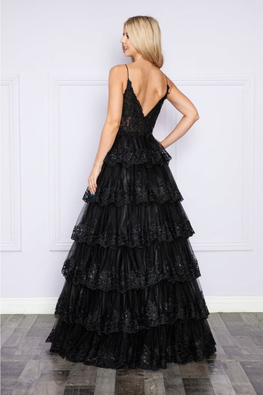 Unlock the allure of beauty with the Poly USA 9402 Embellished Gown, where every stitch creates the delicacy of art. Adorned with intricate embellishments and tiered layers, this gown exudes opulence. The delicate spaghetti straps and v-neckline complement the figure, while the corset bodice ensures a perfect fit. With its sweeping train and open back, this gown is a vision of class. Whether for a wedding guest, gala affair, or prom night, this dress promises to raise your style with undeniable charm.