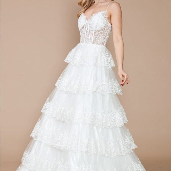 - Details: Spaghetti Strap, Bustier Bodice, Sheer, Tiered Layered, Sweep Train, Embellished, Corset, Open Back, Zipper Closure.
