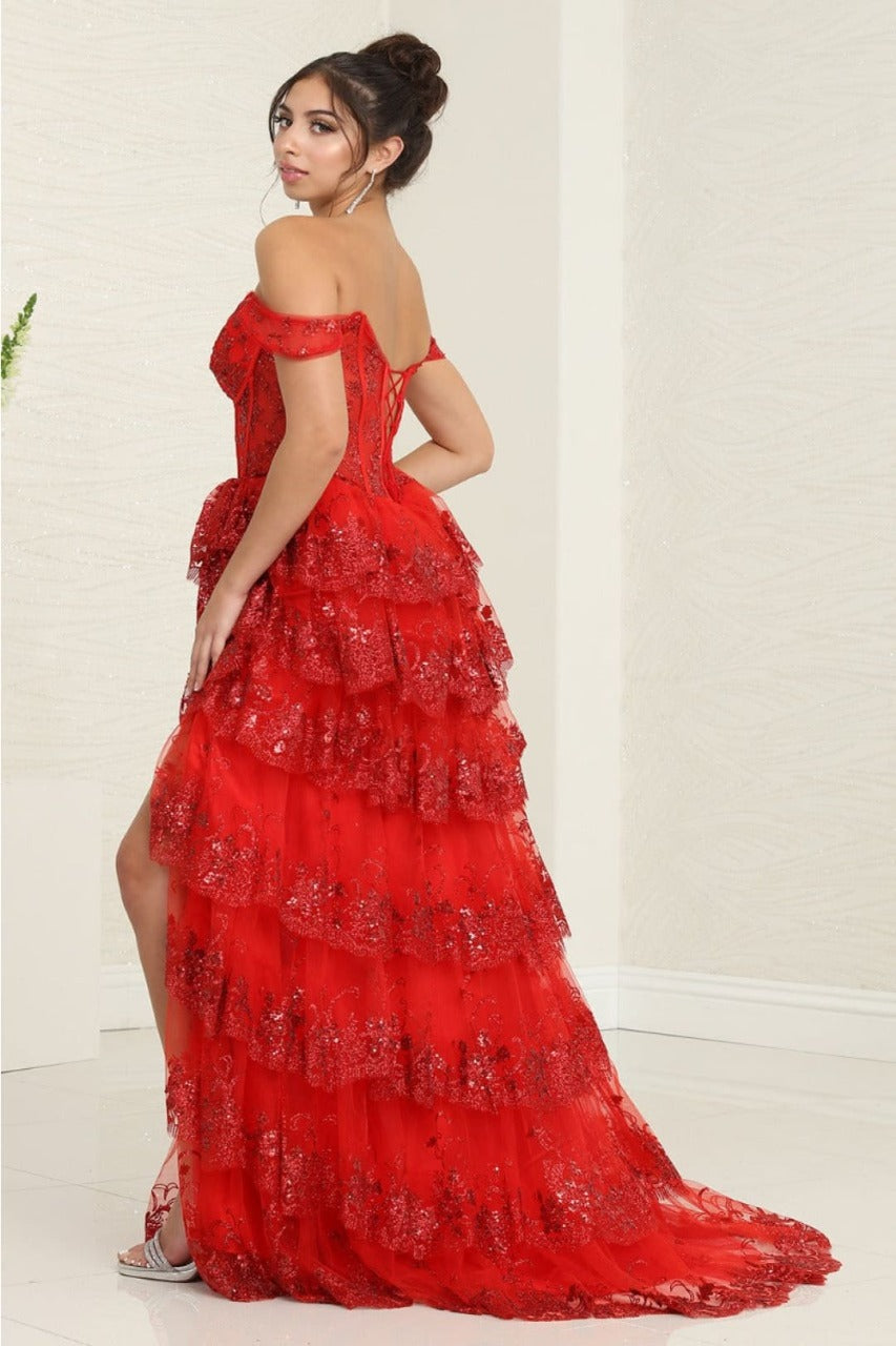 Captivate the crowd in this Royal Queen RQ8115 Prom Gown. This enchanting ensemble features layers of ruffles adorned with delicate sequin accents, exuding elegance at every turn. The alluring V-neck, coupled with a lace-up back, adds a touch of romance to the shimmering effects. Designed in an A-line style, this gown flatters every figure, ensuring you feel confident and radiant throughout the evening. Make an impressive presence at Red Carpet or any Special occasion with this timeless masterpiece.